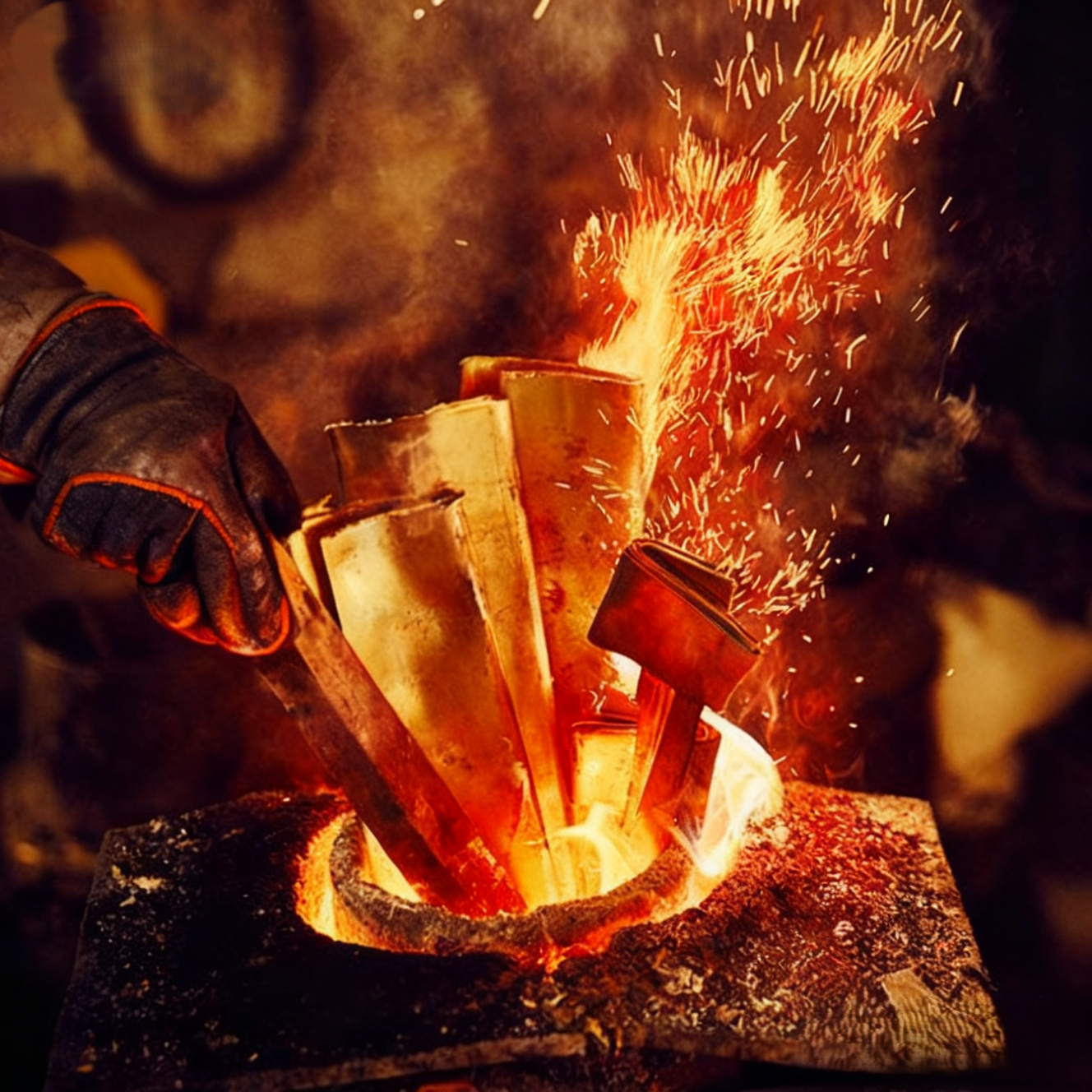 Raw copper is purified and melted in blazing fire, preparing it for transformation.