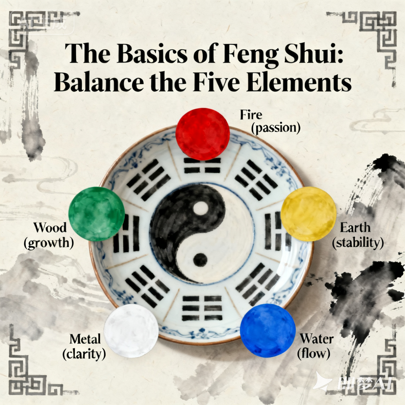 Incorporate Wood (growth), Fire (passion), Earth (stability), Metal (clarity), and Water (flow) to create harmony.