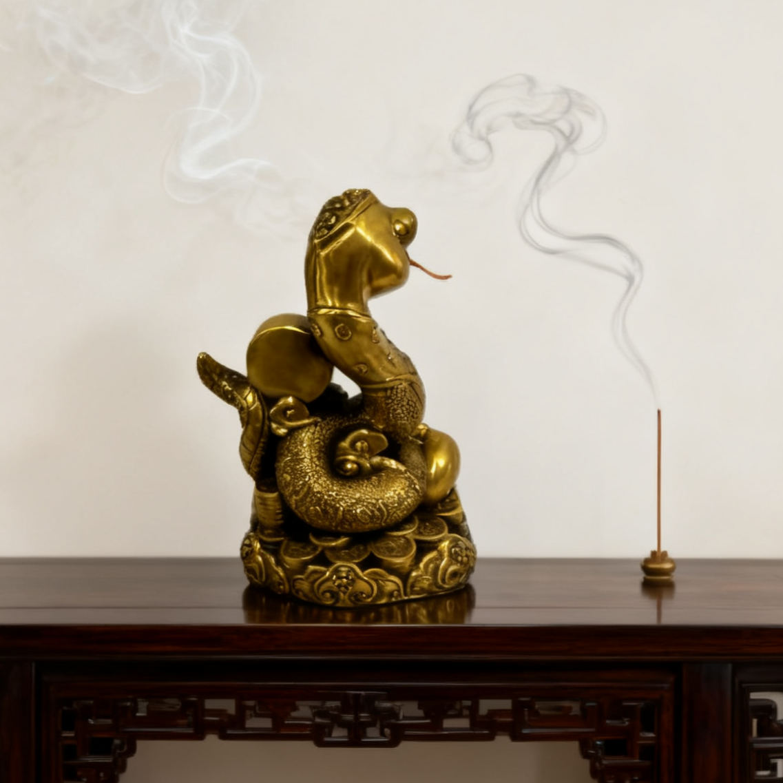 The design features a snake coiled around a ceremonial scepter β an emblem of authority, insight, and fulfilled intentions. With its hand-polished antique brass finish, this figurine blends timeless craftsmanship with meaningful symbolism.